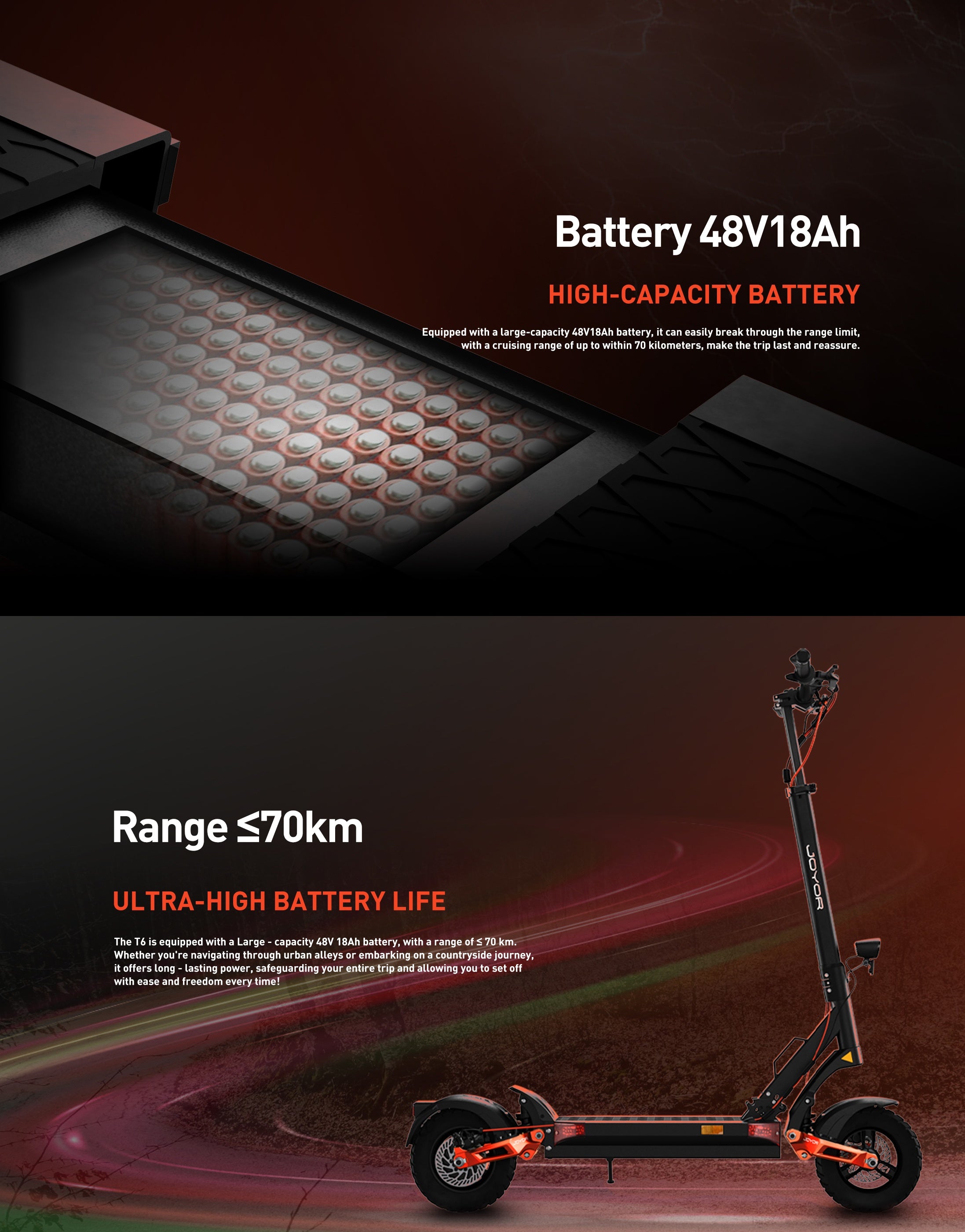 The JOYOR T6 offers a 70km max range (48V 18Ah battery), which is significantly longer than many competitors in its price range (most offer 40-50km). This makes it ideal for daily commutes, multi-stop errands, or exploring the city without frequent charging—perfect for users who value convenience and endurance.