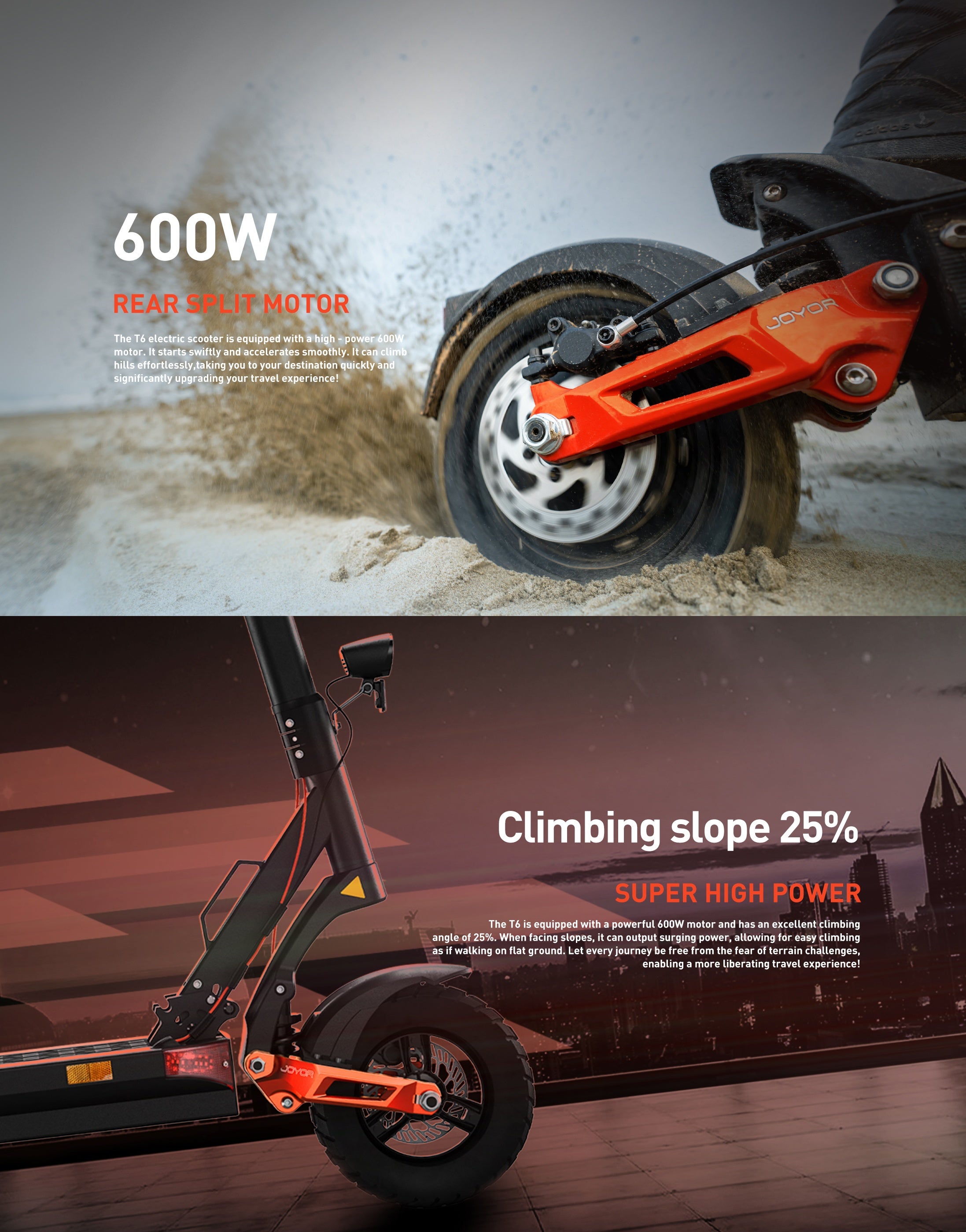 Meet Joyor T6—where power meets freedom. 600W motor, 48V 18Ah battery, 70km range. Conquer 25% slopes, ride any terrain. Built for thrill - seekers and urban adventurers. This is not just a scooter—it’s your ticket to boundless journeys.