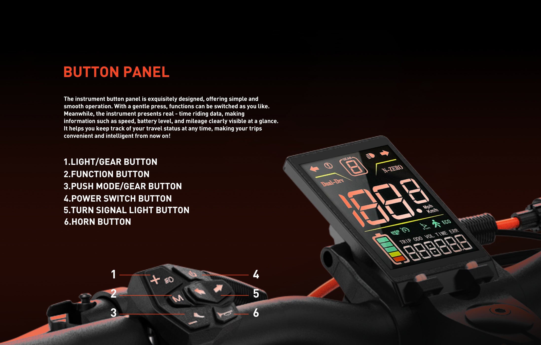 Color LCD dash + smart buttons. Track speed, battery, gear—control your ride with a tap. Intelligent design for modern riders.