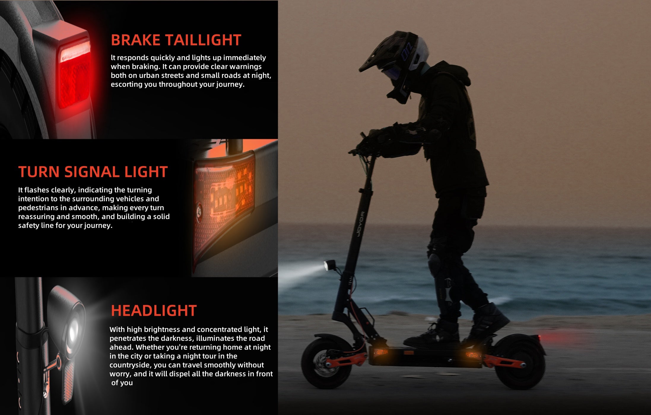 Bright headlight, responsive brake tail light, clear turn signals. Illuminate paths, alert others—ride safe in any light.